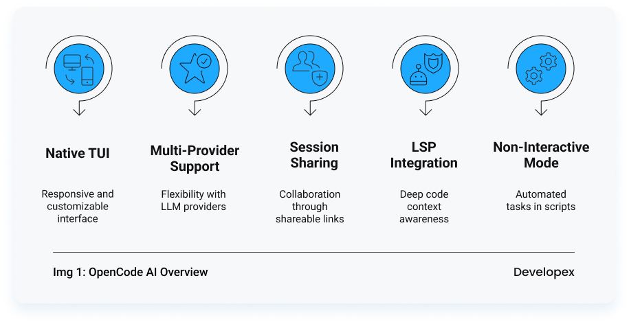 | OpenCode AI | AI coding agent for the terminal | Native TUI, LSP integration, session sharing, non-interactive mode | Context-aware code understanding, automated execution of tasks |