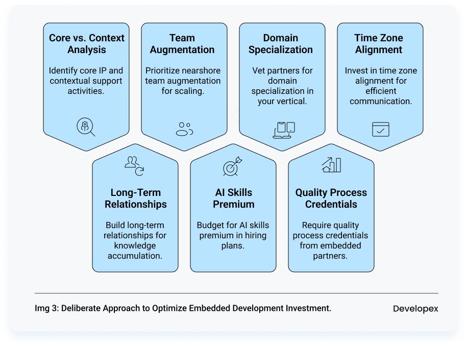 Optimizing your embedded development investment in 2026 requires a deliberate approach to team architecture, vendor selection, and cost-quality trade-offs – summarized in the seven principles below.